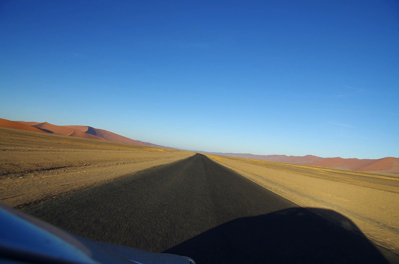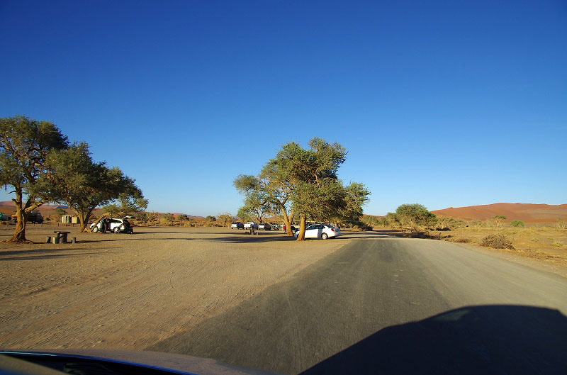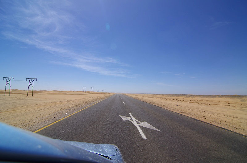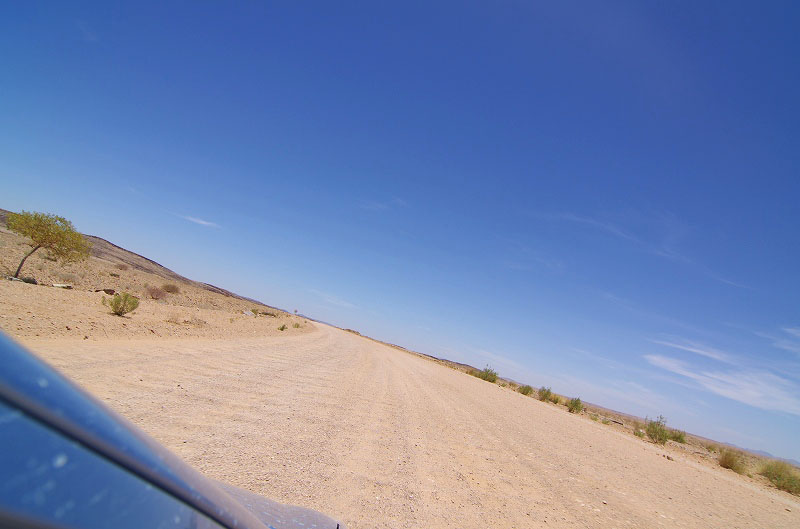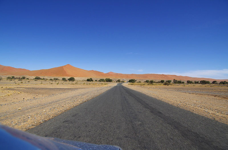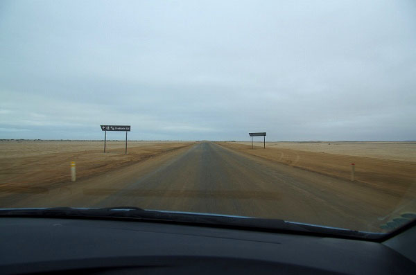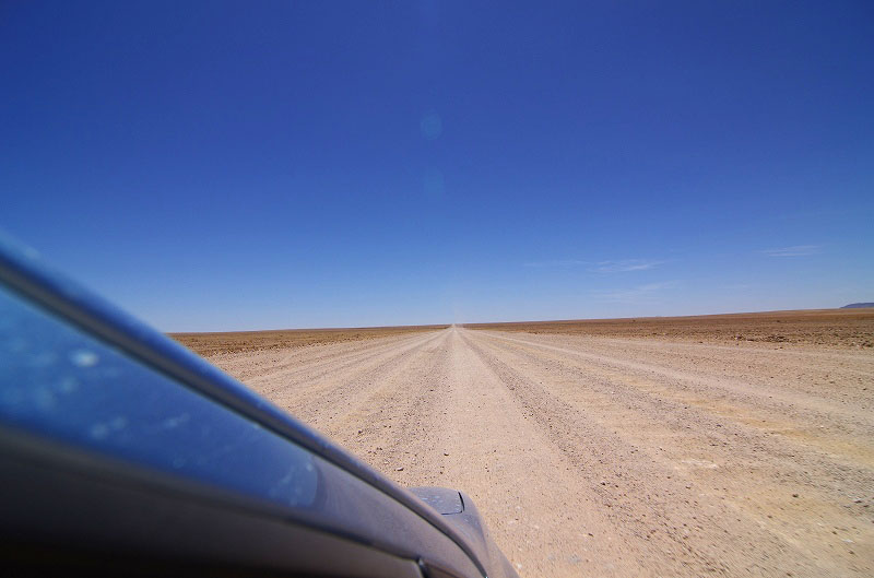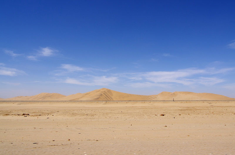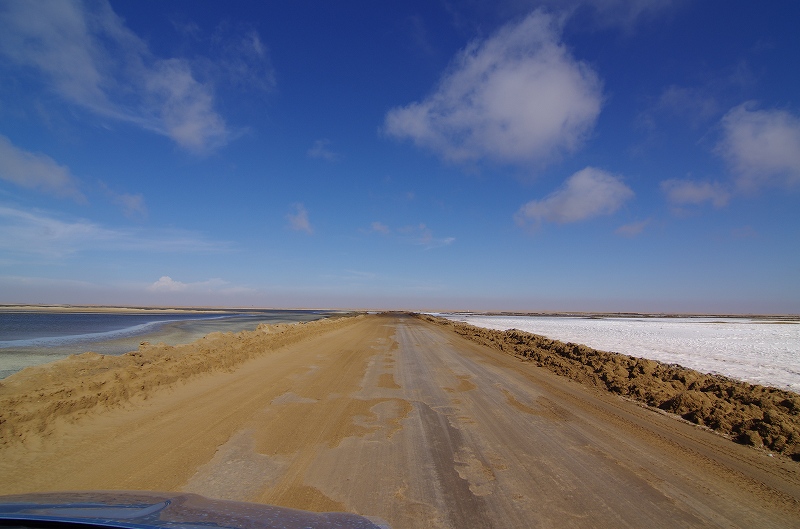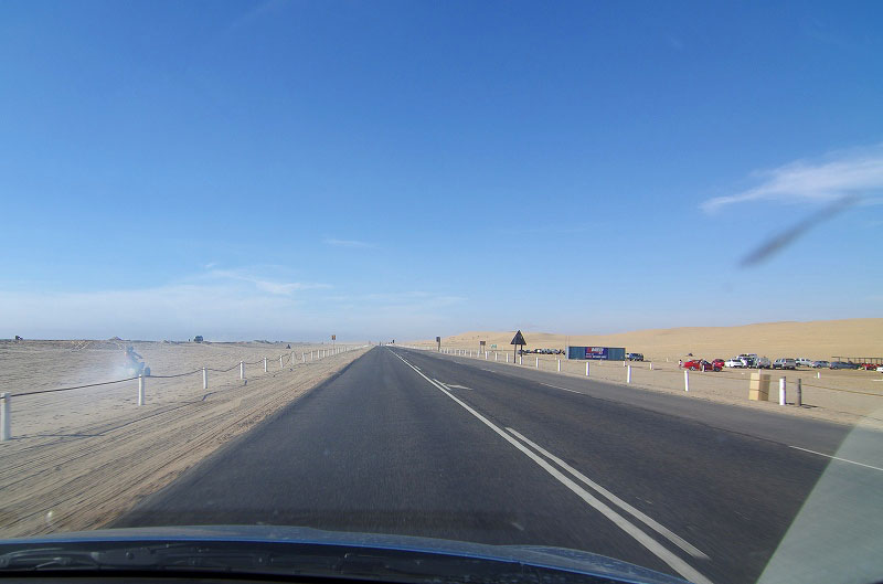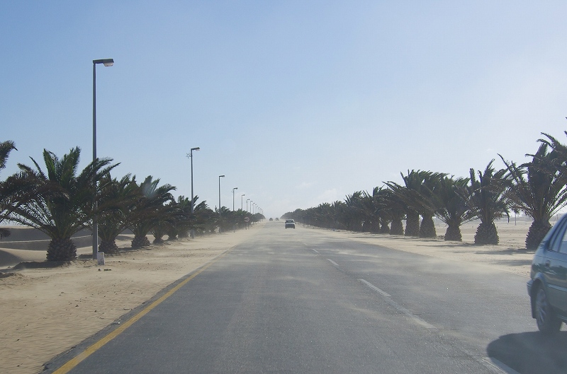 両サイドに砂丘が聳えていますが、真ん中は幅500mぐらいの平らな台地が続いていて、道路はそれに沿って伸びています。(かつての川底でしょうか?)