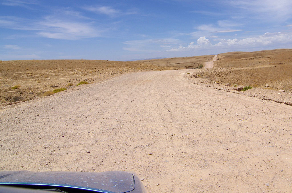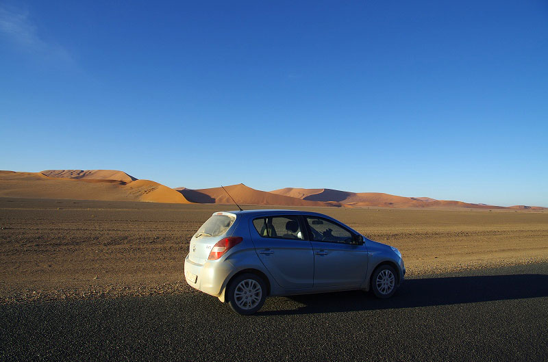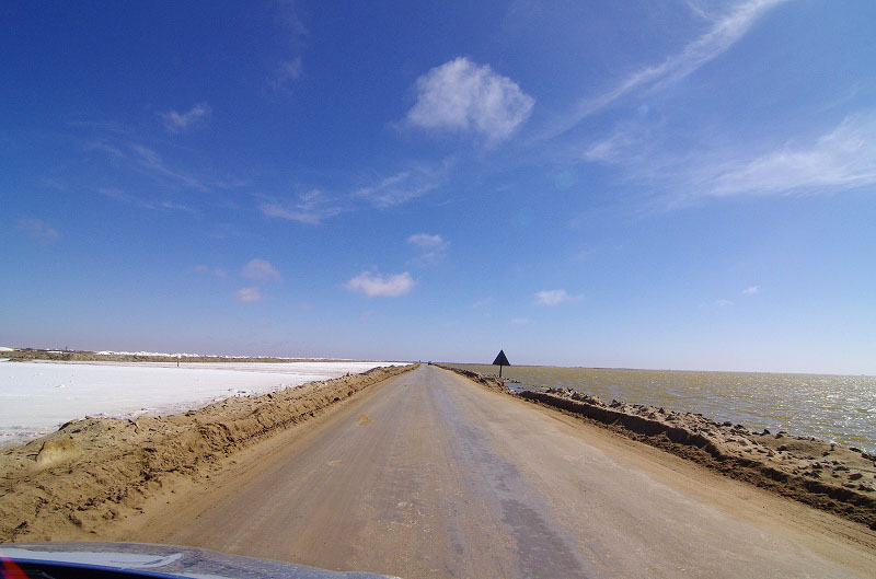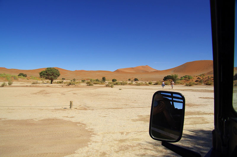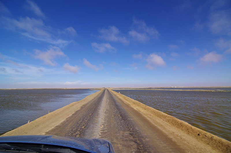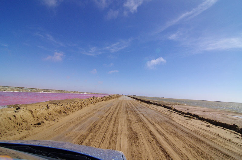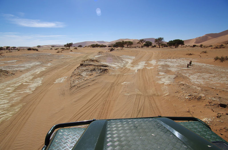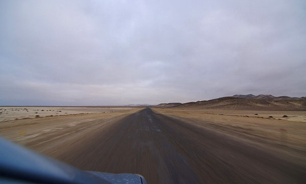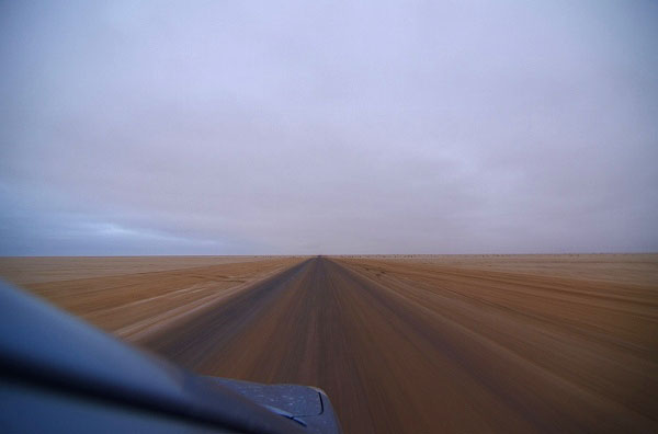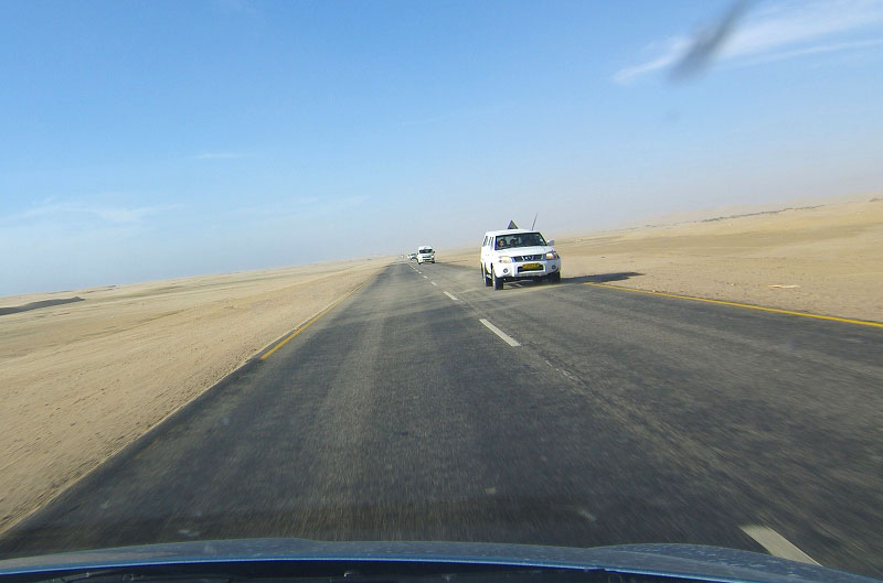 両サイドに砂丘が聳えていますが、真ん中は幅500mぐらいの平らな台地が続いていて、道路はそれに沿って伸びています。(かつての川底でしょうか?)