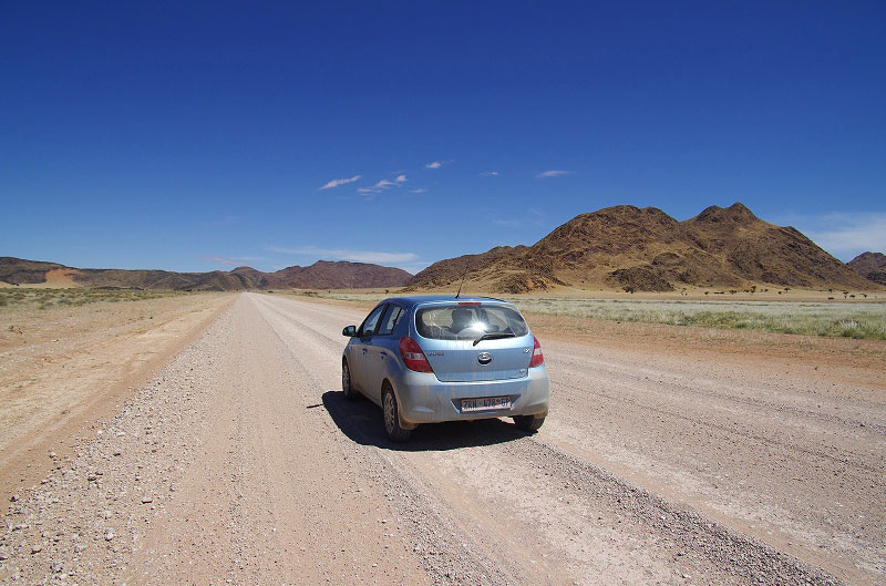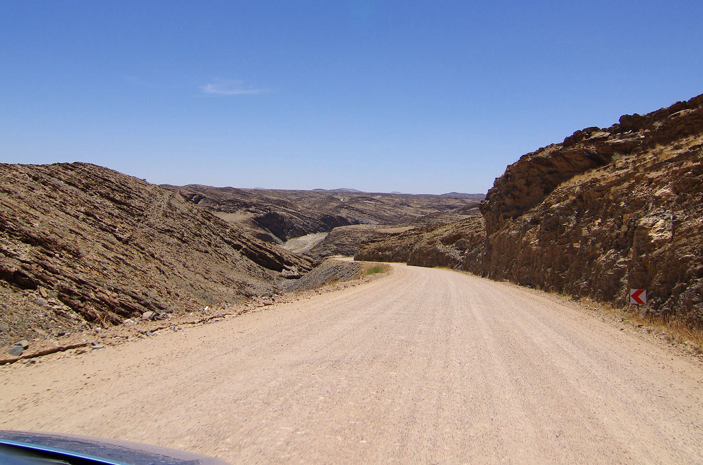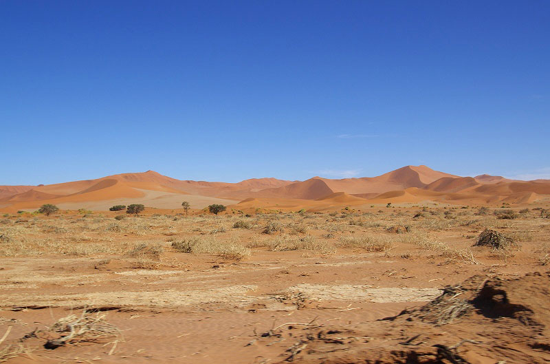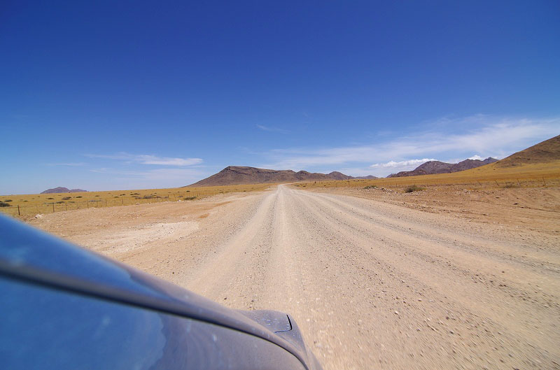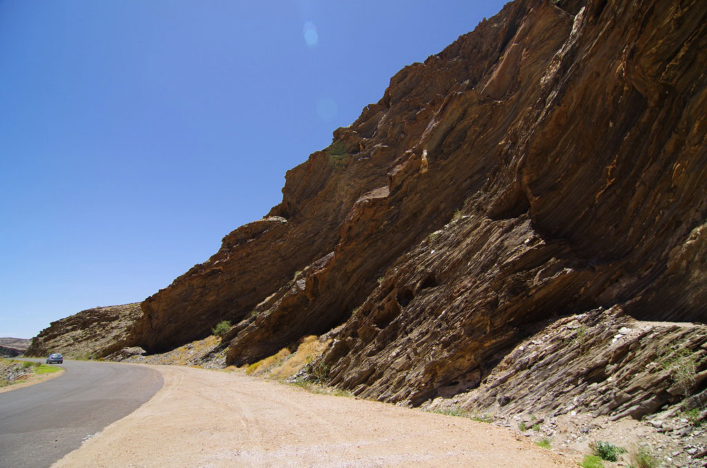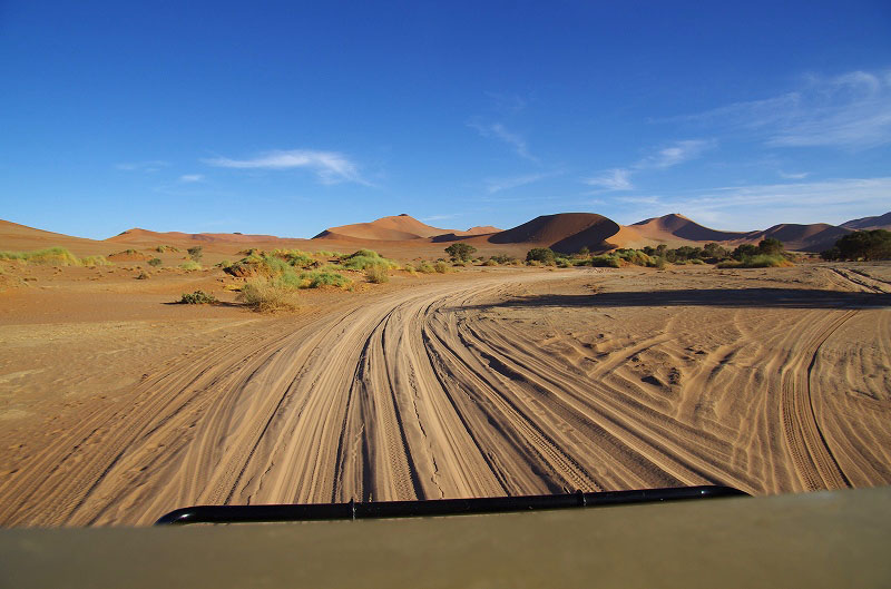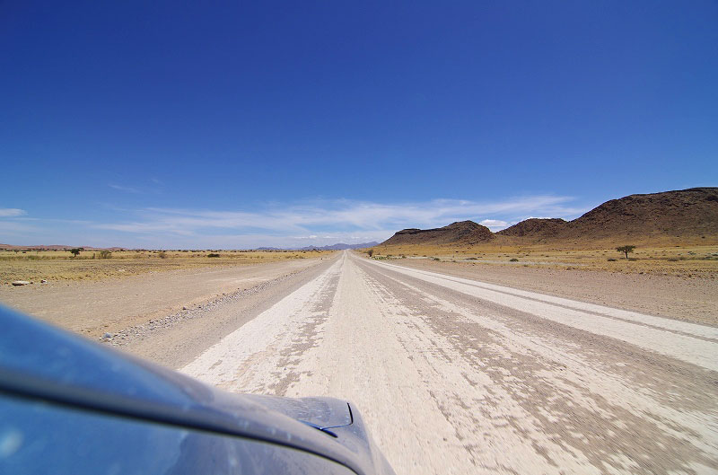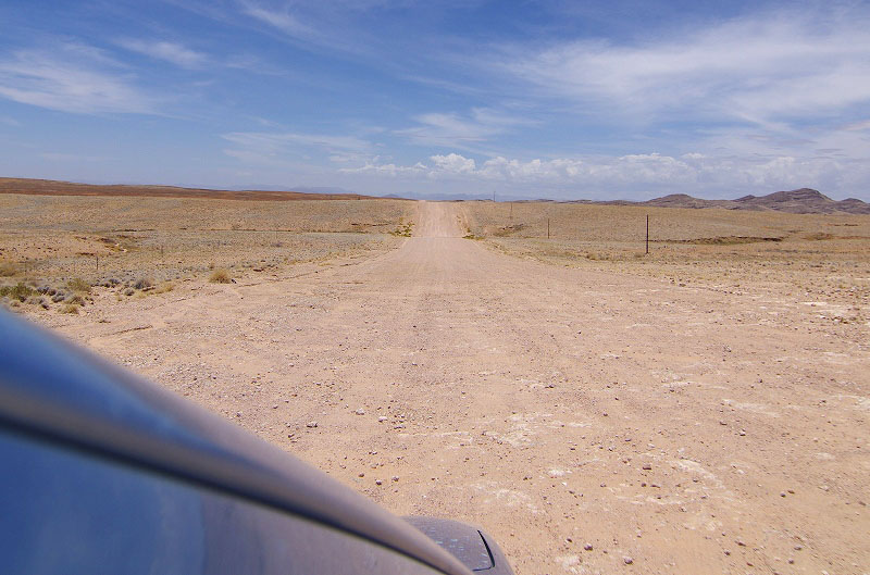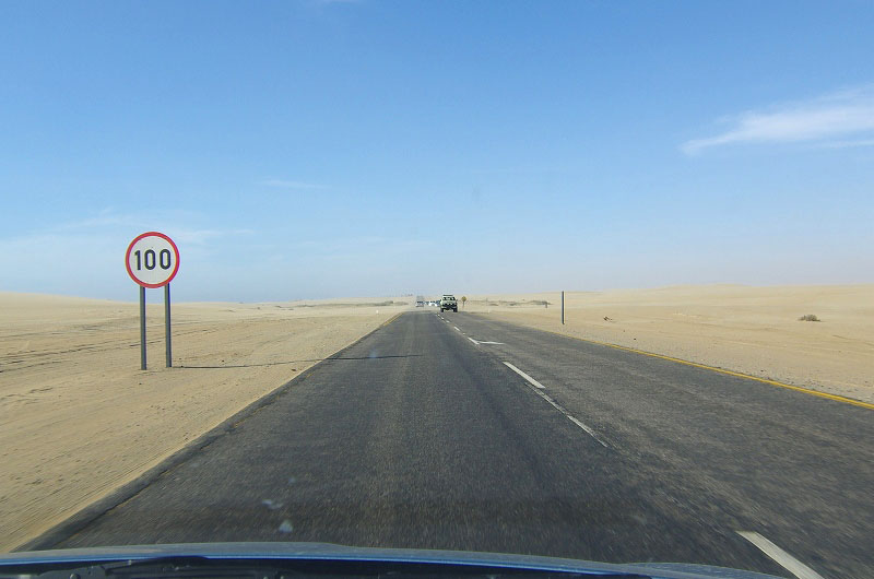 両サイドに砂丘が聳えていますが、真ん中は幅500mぐらいの平らな台地が続いていて、道路はそれに沿って伸びています。(かつての川底でしょうか?)