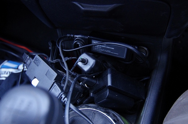 シガーライター電源を3つ又で分岐し、インバーター(USB端子つき)で100Vに変換しつつ、さらに蛸足配線で分配。