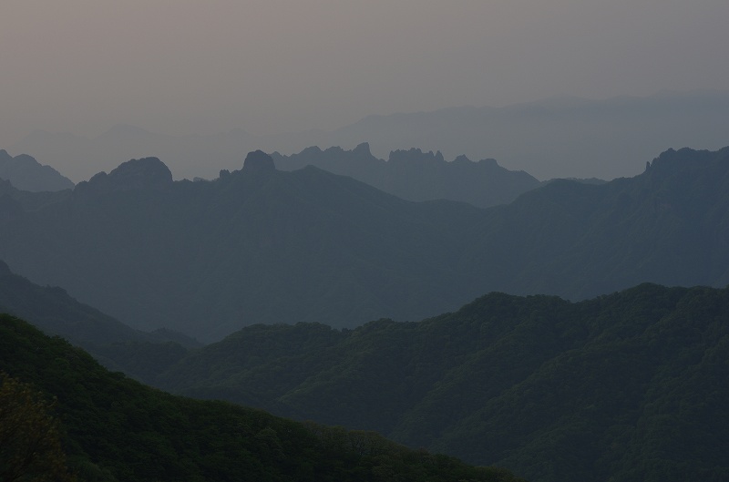 淡い朝日に照らされた妙義の山々です。