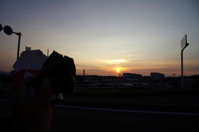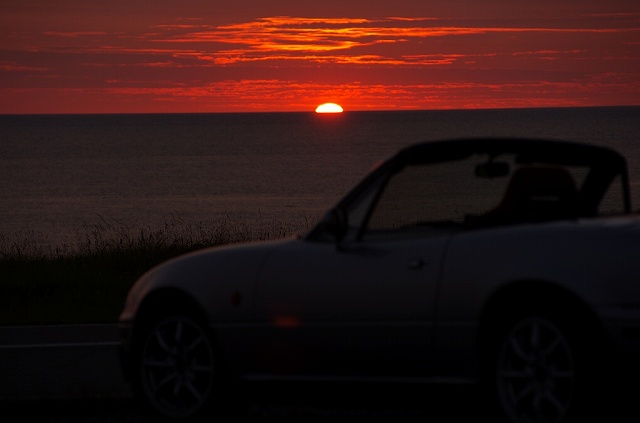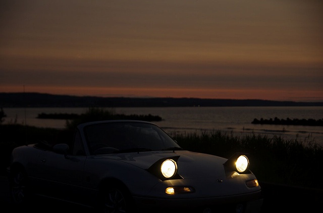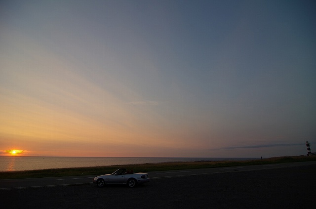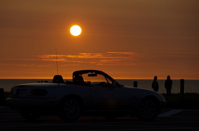 食後にちょうど夕日タイムになったのですが、後からやってきた女性2名がロードスターと太陽の間の場所で夕日鑑賞体制に入ってしまったので、少しだけ場所を移動しました。