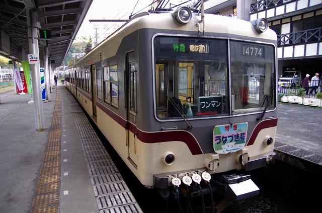 というわけで、温泉上がりに無防備で乗った過去2回よりは多少マシではありましたが、相変わらず体が冷えきった状態で富山電鉄の特急「うなづき号」に乗り込みました。(15:25)