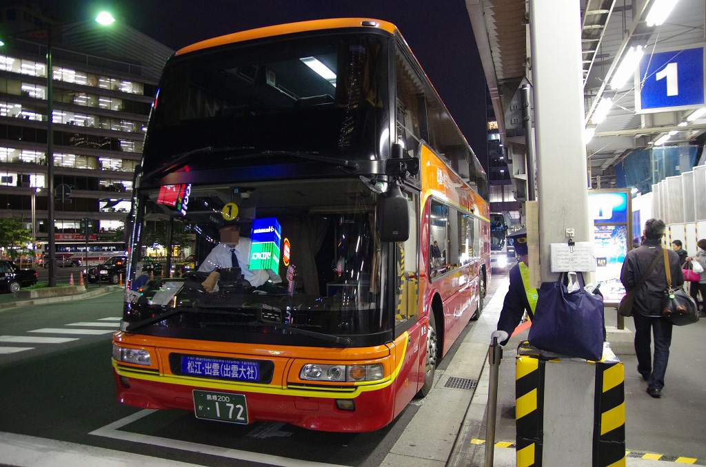 まずは東京駅から夜行バス(JRが運行しているスサノオ号)に乗って松江を目指します。(19:00)
