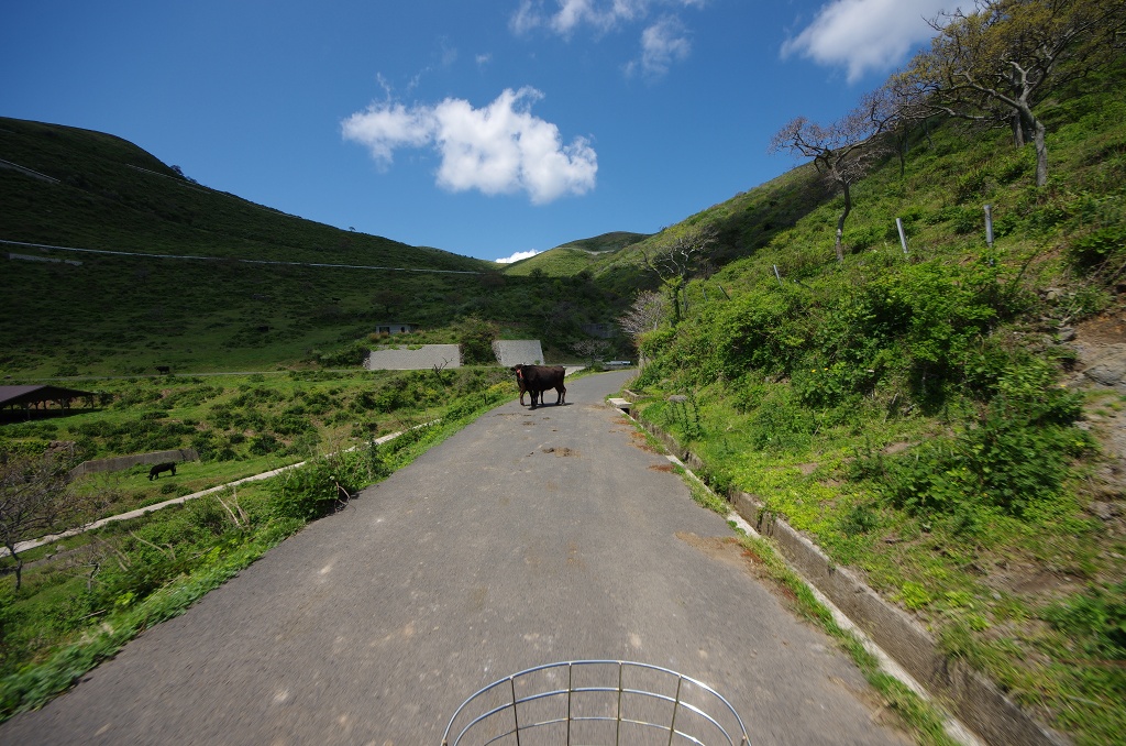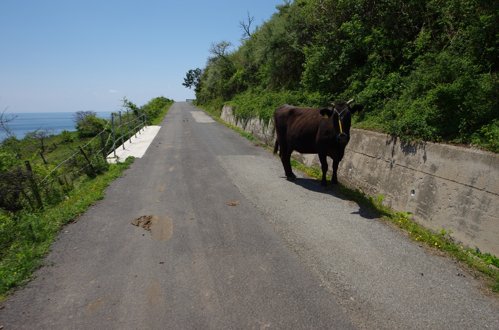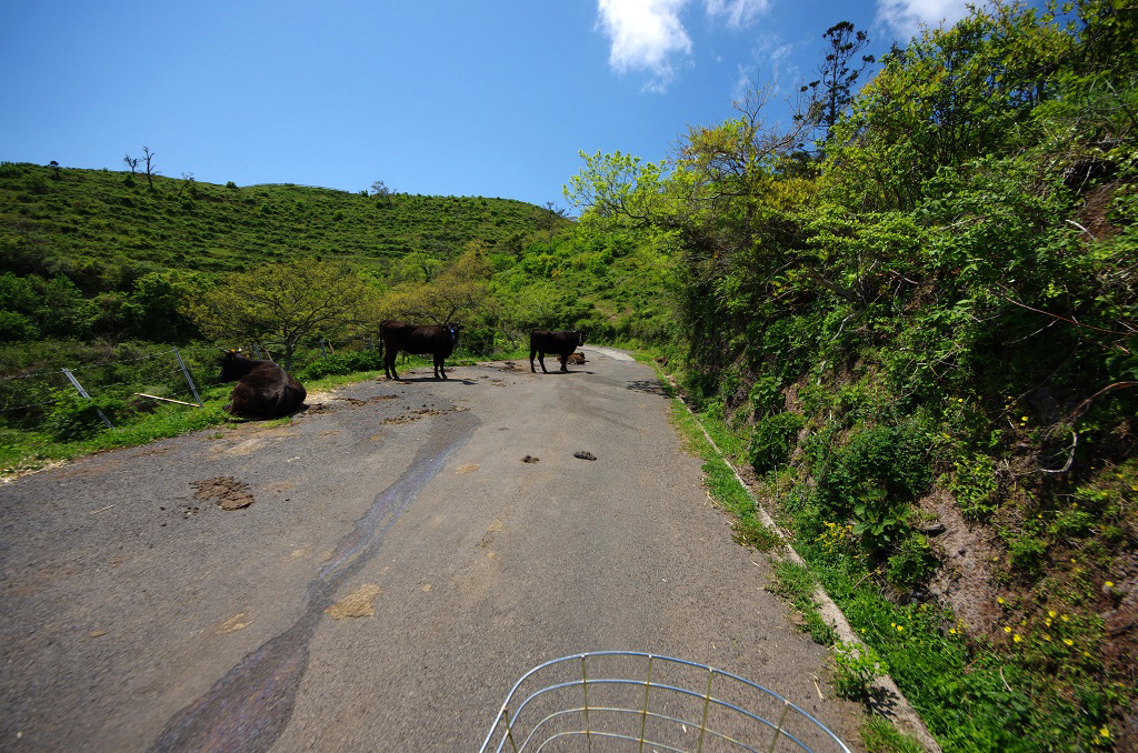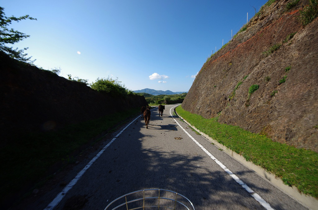 灯台からの下り道、車を見ても逃げない牛達も自転車に乗ったむき出しの人間は怖いらしく、必死で道路上を逃げていきます。