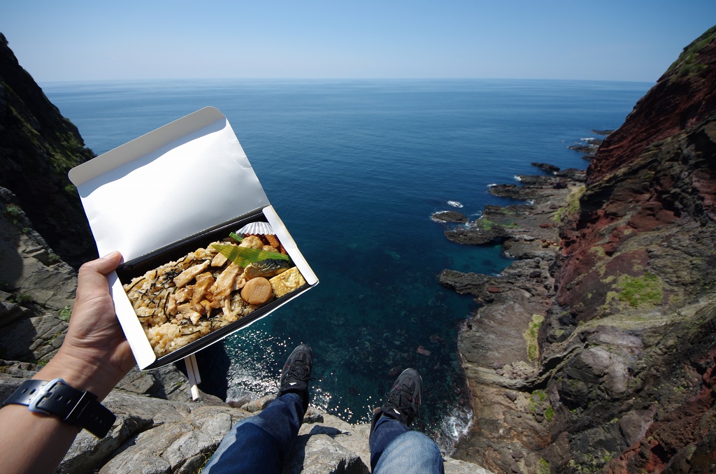 なので、崖に腰掛けてローソンで買ったお弁当を頂きます。