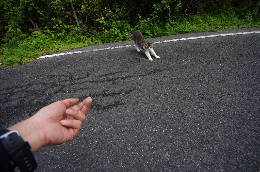普通の野良猫なら車から人が降りた時点で飛んで逃げていくところですが、そういう素振りを見せなかったので呼び寄せてみます。