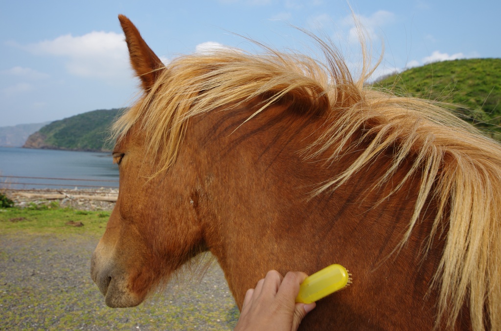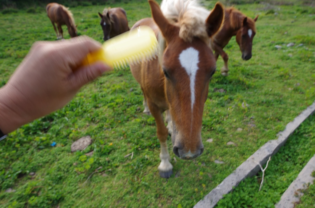 馬が放牧されていたので、今度は試しにブラシを振ってみたところ数頭が喜んで寄って来ました。