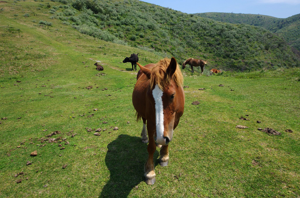 ちゃんと顔を覚えていたのか、すぐに歩み寄ってくる馬たち。(写真の奥にはまだ遊歩道上で寝ていた子牛と睨みをきかせる母牛。もちろん避けて通りましたよ)