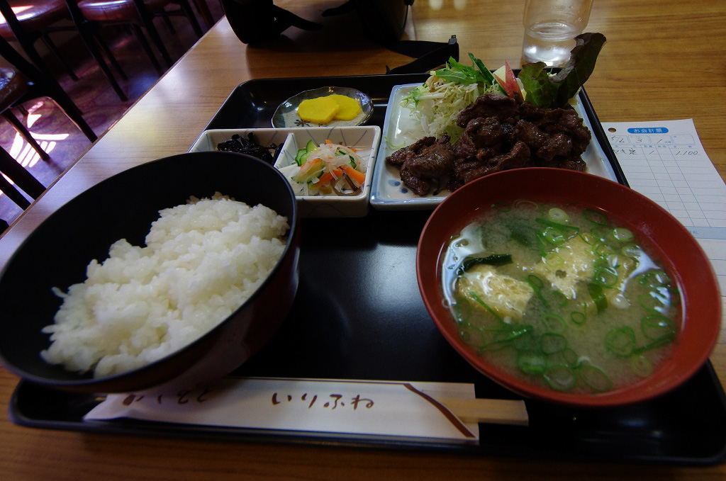 観光協会で確認したところ、この時間(14時前)には観光客向けの食堂はオーダーストップになっちゃってるらしいので、地元客向けの食堂に入って焼肉定食を頼みました。