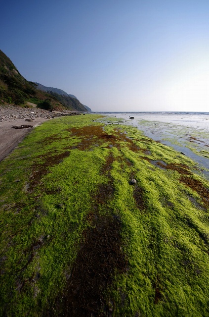 波で削られた波食棚に海藻がびっしりと付いてます。