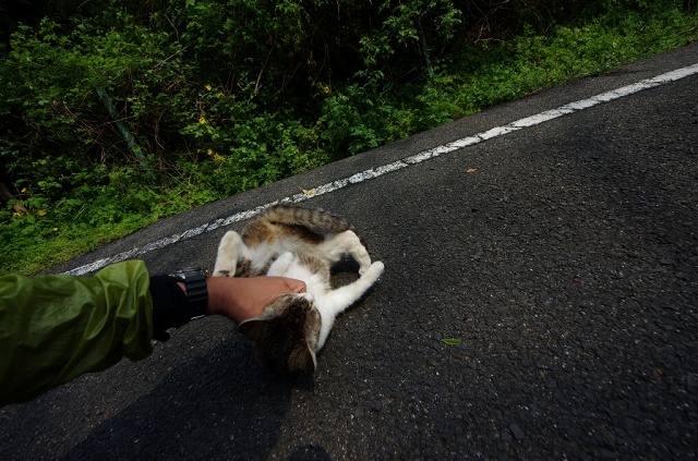普通の野良猫なら車から人が降りた時点で飛んで逃げていくところですが、そういう素振りを見せなかったので呼び寄せてみます。
