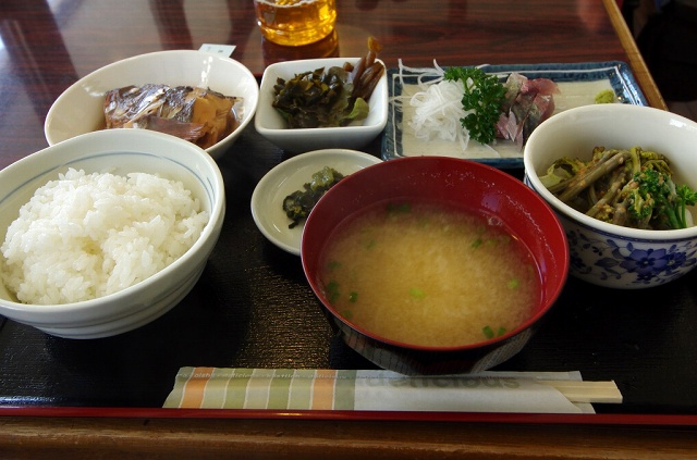 出港まで10分だけ時間があったので、港の食堂で日替わりランチ(ラッキーな事にメジナの煮魚定食)を食べていたらフェリーの乗船手続きが始まってしまったので、ちょっと焦りました。(12:00)
