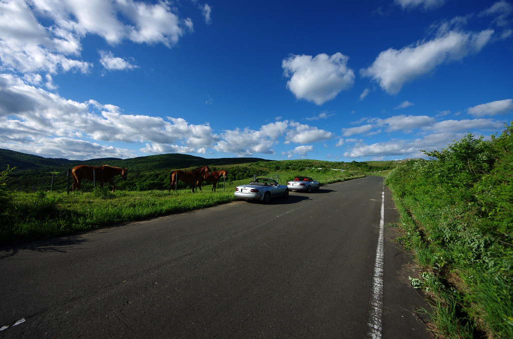 (先ほどの写真も遥か彼方からロードスターの側まで馬に歩いてきてもらいました。というか気に入られると馬同士の縄張りの範囲で付いてきてくれます)