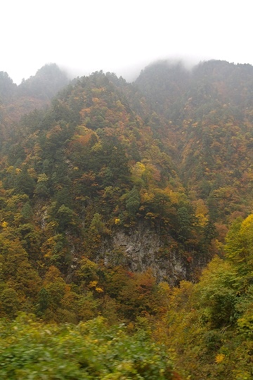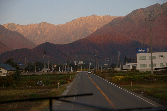 後ろから陽が昇り、北アルプスの山々を黄色く照らしています。途中の紅葉がすばらしく綺麗です。キツネが横切り猿が飛び出す道をバスはのんびり走って行きます。