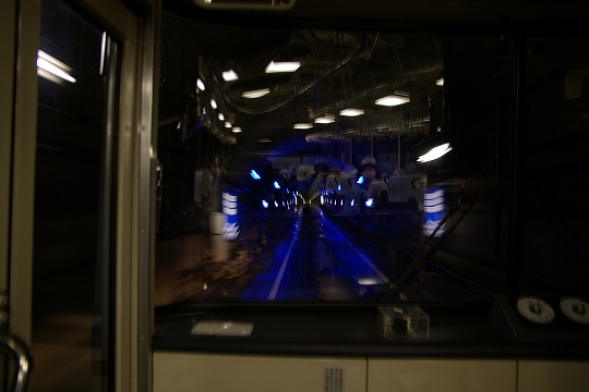 有名な黒部ダム建設工事で困難を極めた破砕地帯を通過するトンネルを通って(青いところが破砕地帯を表示する灯りです)黒部ダムに入ります。時間にして15分。あっという間です。黒部ダム駅はトンネルの中にあり、ここで登山組と観光客に別れます。