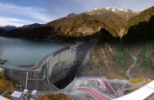 黒部ダムです。北アルプスの山々は雪で真っ白になってます。