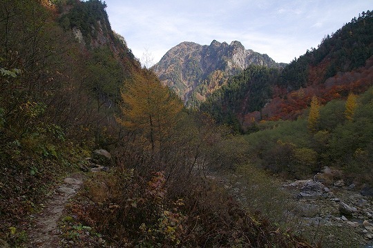 その後しばらくは河原の道をのんびりと行きます。1時間ぐらい歩いて北アルプス奥地へ進む道と分かれると、いよいよ日電歩道に突入します。