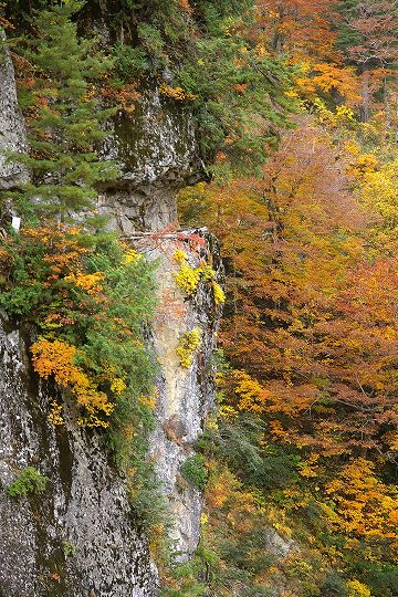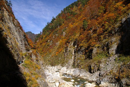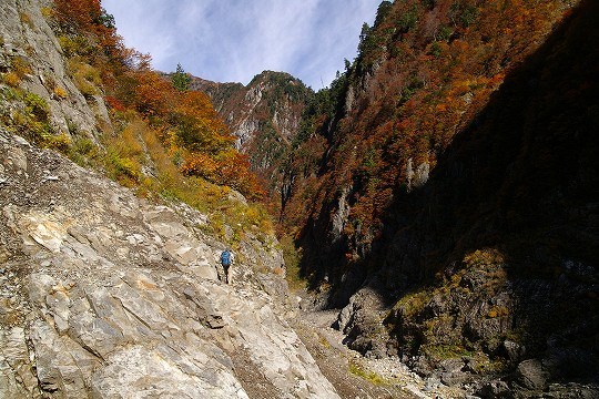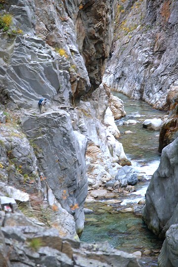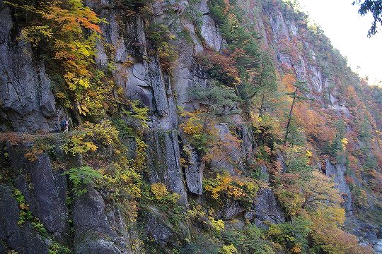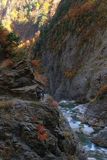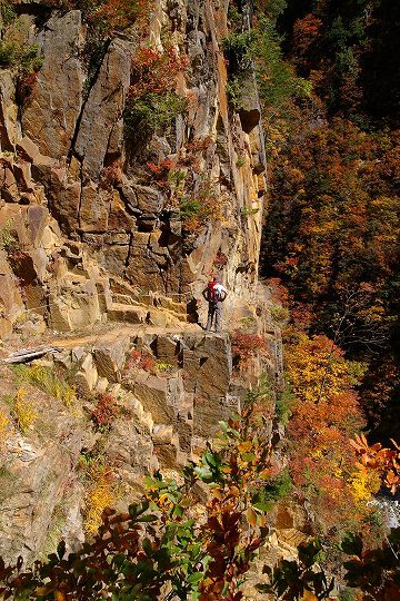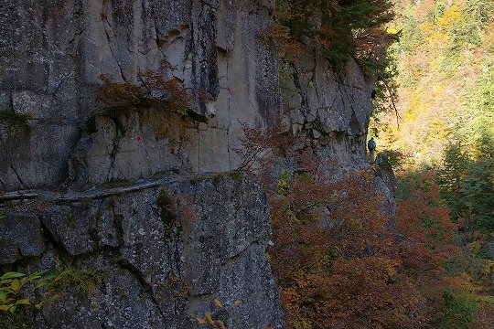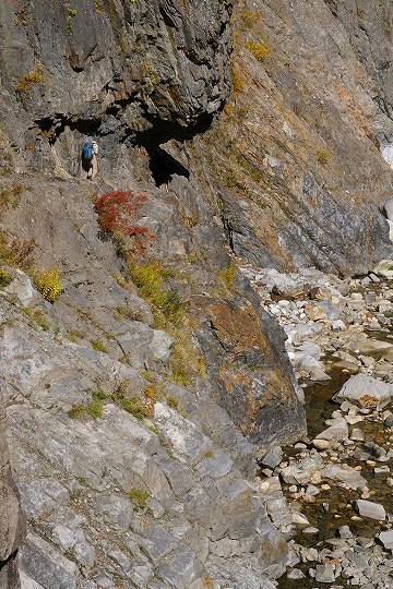 だんだん切り立った場所を歩くようになります。(川にせまった崖や急斜面のことを方言で「へつり」と呼ぶそうです。おじいさん中央付近に写ってます)
