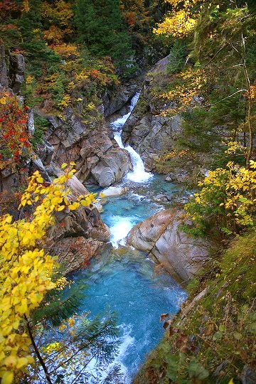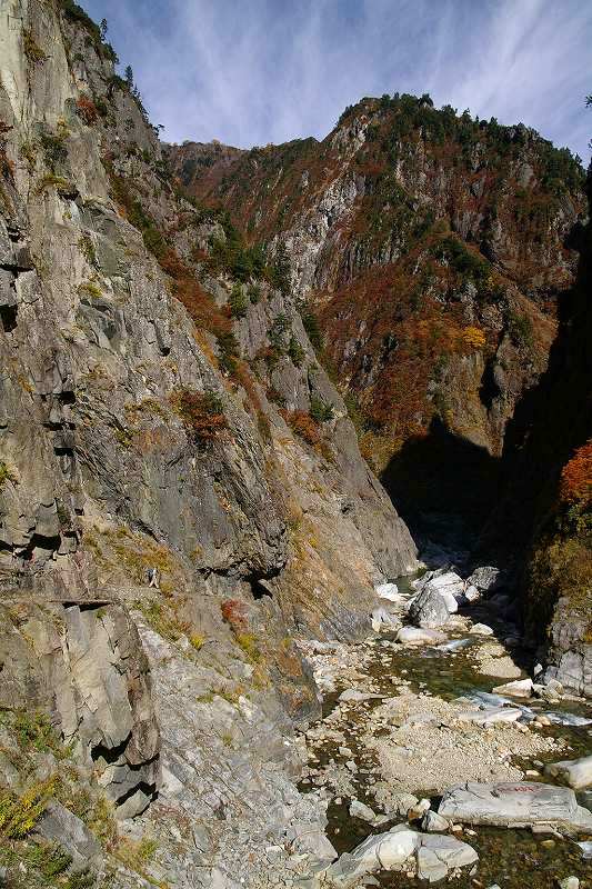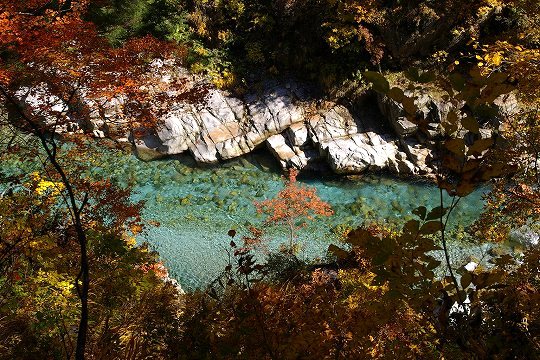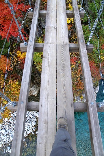 突然陰鬱な谷へと入り込みます。十字峡です。こことはちょっと別の場所に黒部川含め3本の川が流れ込んで、十字を形作っています。この写真は吊り橋から撮影しています。