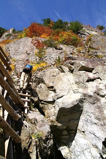 完全に橋が崩落しているところは、こんな立派なハシゴがかかって高巻きで迂回します。