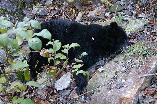 おそるおそる近づくと、なんとクマの死体でした。どうやら谷を転げ落ちて、ここで死んだようです。つつくカラスも居ないので、綺麗に死体が残ってました。(ついさっき落ちてきたのかもしれません)