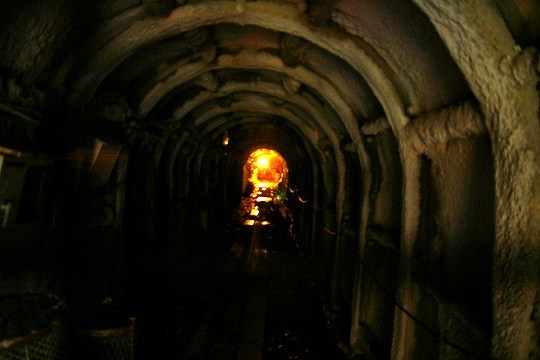 水が滴る曲がりくねって真っ暗な狭いトンネルを頭をぶつけないようにかがみながら、100m以上進んで行きます。