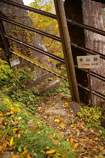 私は当然のように登山道に入りますが、どうもこのまま行くと黒部ダムを見ないまま道を進んでしまいそうな雰囲気だったので、3分ぐらい下ったところで思い返し、荷物を置いて、黒部ダム駅に戻ります。