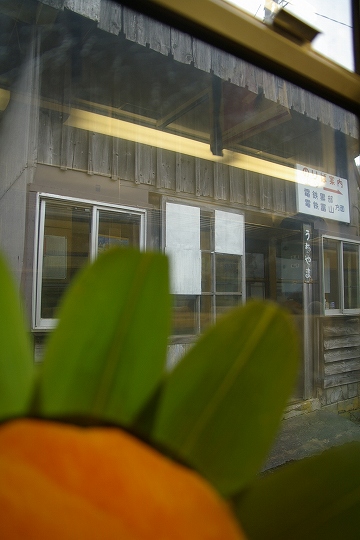 今にも朽ち落ちそうな駅を眺めながら、マスの寿司をぱくつきます。(これはおいしい!)